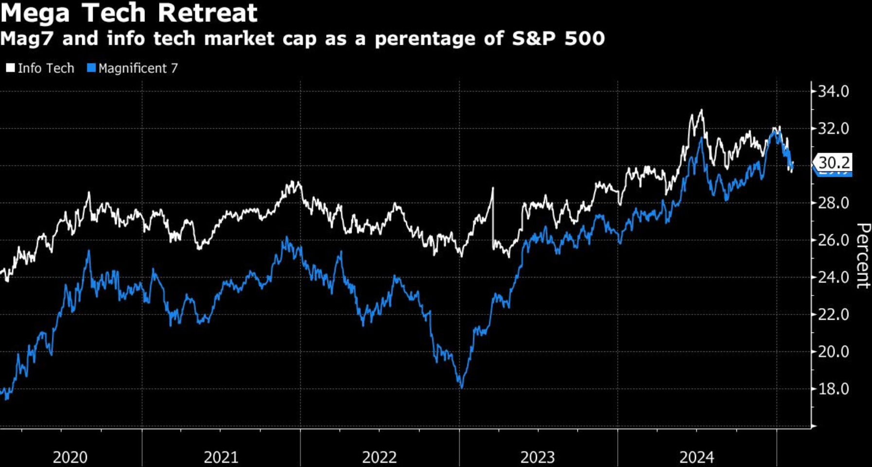 다들 실적 직후 애프터 마켓에서 뿐 아니라 최근 주가가 하락했는데, 이게 반드시 나쁜 것만은 아니거든요. M7주식들을 트래킹하는 지수는 지난 6개월 동안 S&P500와 비슷한 수준을 유지하고 있죠 (차트). 지수가 얼마나 불균형적인지를 고려할 때, M7주가가 급등하지 않는다는건 전체 시장에 있어 건강한 조정일 수 있습니다.
